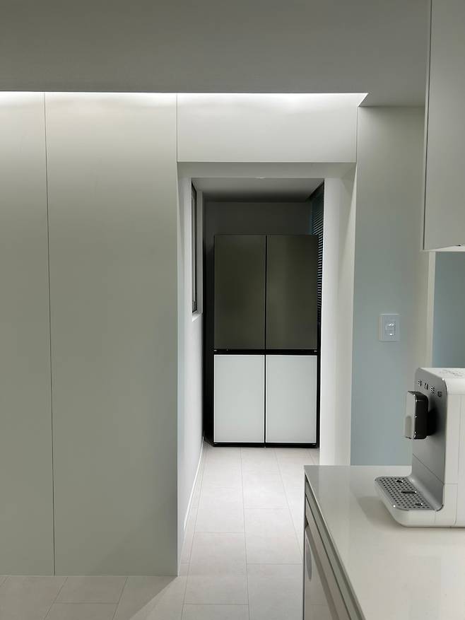 정면에서 바라보면 이런 느낌이에요. 원래부터 냉장고 자리였던 것 마냥 쏙 들어갔는데 한 가지 아쉬운 점은 색이 바뀌는 무드업 냉장고인데 숨어 있다는 점이에요.