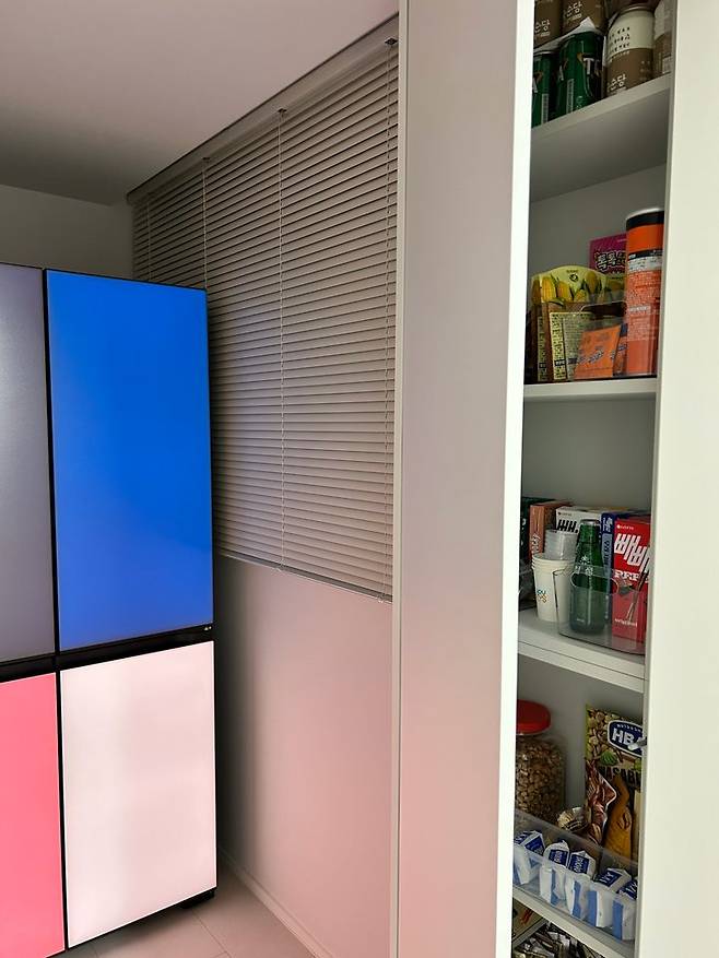 공간이 조금 남아서 냉장고 문 열었을 때 방해되지 않는 선에서 키큰장을 짜주었어요. 혹여나 햇빛 때문에 냉장고가 변색될까 봐 톤에 맞는 블라인드도 달아 주었어요.