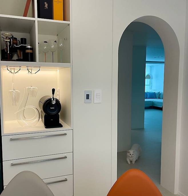 홈바 공간은 오로지 술을 위한 공간이에요. 와인셀러 옆에 있는 만큼 좋아하는 와인잔을 진열해놓고 생맥주 기계까지 올려놓고 반주를 하거나 분위기 내고 싶을 때 와인 한 잔씩 하고 있어요. 거실에서 다이닝을 바라볼 땐 깔끔하게 해주고 싶어 다이닝 룸 안에서만 보일 수 있도록 설계했어요.