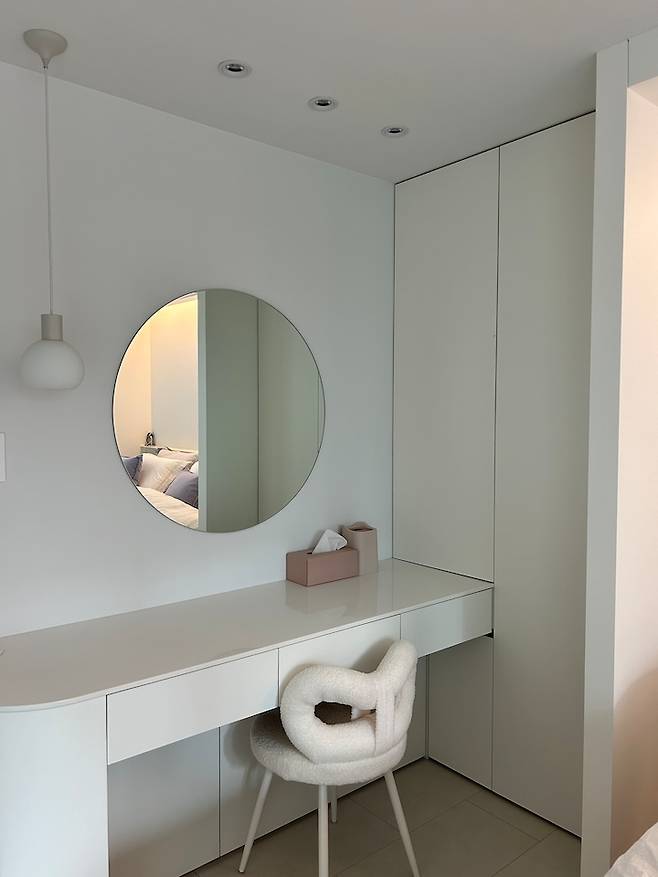 펜던트 조명으로 포인트를 주고 원형 거울로 또 다른 인테리어 포인트를 주었어요. 사진에서 보시면 화장품을 보관하는 서랍이 3공간으로 나뉠 만큼 넓고 긴 공간으로 사용할 수 있답니다.