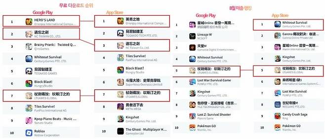 앱스토어에서는 모바일 생존 전략 게임 '화이트아웃 서바이벌'이 1위를 차지했다. 화이트아웃 서바이벌은 8월에 열린 다다오청 여름 축제와 협업해 '한상 불꽃놀이 축제'를 개최하면서 높은 화제성을 기록, 유저 참여도를 크게 끌어올렸다. 특히 행사 기간 동안 60만 명 이상 관람객이 현장을 찾았고, 브랜드 인지도가 크게 올랐다는 평가다. 이에 힘입어 대학 캠퍼스 투어 이벤트 등 다양한 온오프라인 연계 이벤트를 개최할 예정이다. 구글플레이에서는 리니지W와 리니지M이 나란히 2, 3위를 기록하면서 대만 모바일 MMORPG 시장에서 여전히 강세를 보여주고 있다.