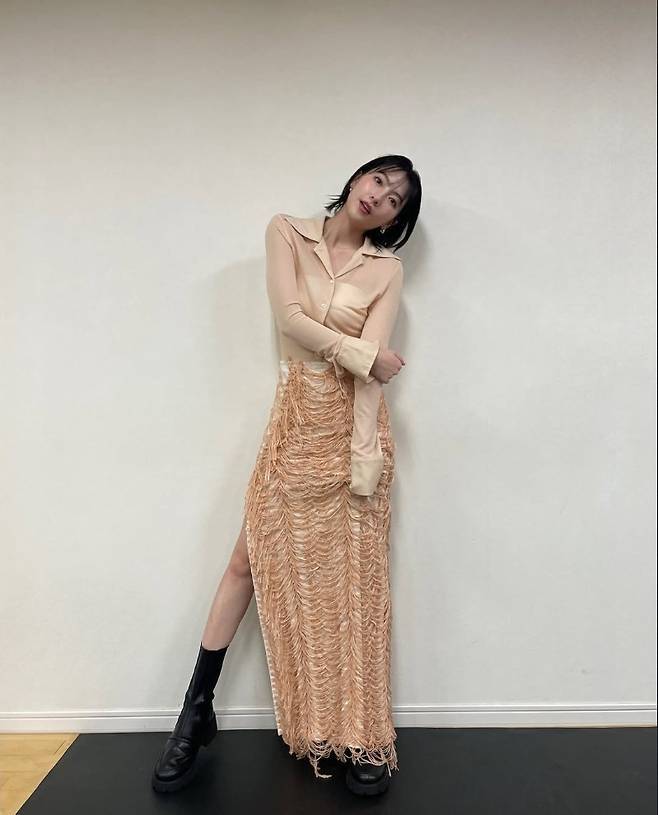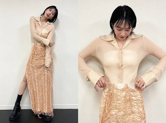 강지영은 누드 톤의 시스루 셔츠와 독특한 텍스처의 롱스커트 룩을 선보이며 매혹적인 분위기를 연출했습니다.