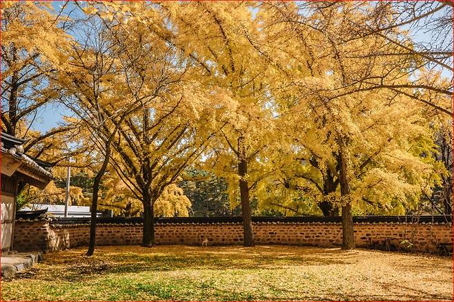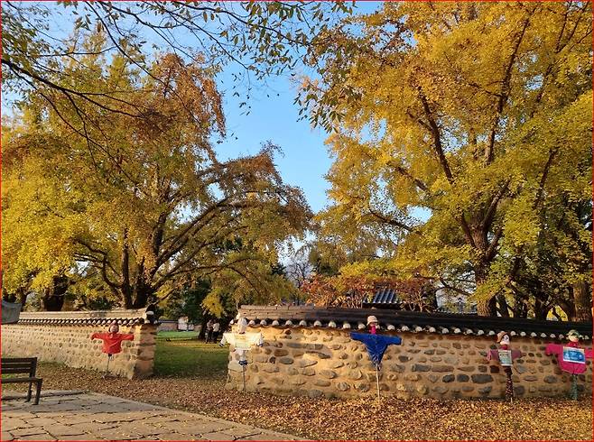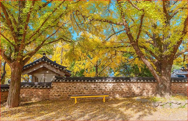 천 년 동안 용이 되기를 기도하던 구렁이는 마침내 황룡이 되어 여의주를 물고 승천했고, 까마귀들이 황룡의 여의주를 은행으로 착각해 마을로 물고 오면서 은행나무가 자라게 되었다고 하지요. 그래서인지 마을에 들어서면 은행잎마다 신비로운 기운이 감돕니다.