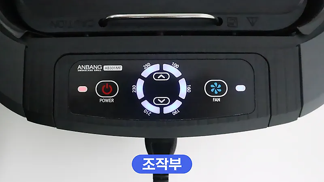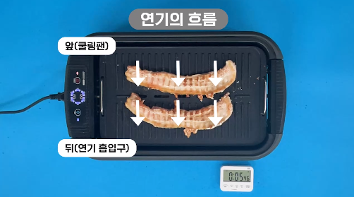 쿨링팬을 작동시키면 그릴 팬 앞쪽으로 연기를 빨아들여 팬 아래로 내려주는데, 내려간 연기가 하부 기름받이의 물과 결합시켜 연기를 나가지 않도록 줄여주기 때문입니다.
