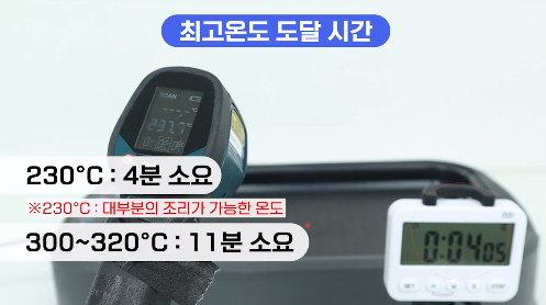 외부 조작부를 통해 온도는 6단계로 조절 가능한데, 대부분의 음식을 조리 할 수 있는 230℃까지 도달하는데 약 4분 정도 소요됐으며, 11분 정도면 최고온도인 약 300~320℃까지 도달합니다. (이는 전기그릴 중 빠른 편에 속하는 가열속도입니다.)