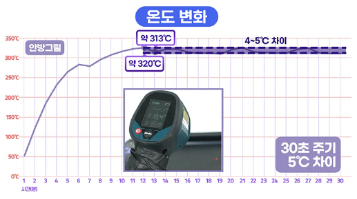안방그릴도 목표온도에 도달하면 꺼졌다가, 켜지는 현상을 반복하는 것은 동일하지만 주기가 30초 정도로 짧아 10℃내외로 온도가 급격하게 떨어지지 않습니다.