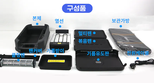기본 구성품으로 그릴팬과 볶음팬 두가지의 팬을 제공하며, 본체와 결합할 수 있는 전원케이블, 기름유도판, 기름받이, 쿨링팬, 팬커버가 포함되어 있습니다.