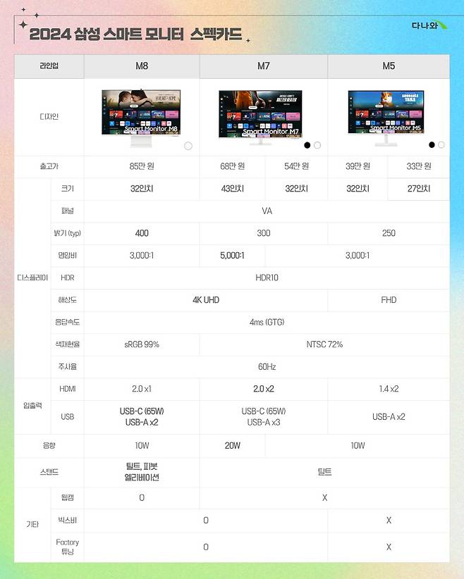 2024년형 삼성전자 스마트 모니터의 라인업은 크게 3가지다. ▲AI 프로세서를 탑재한 4K UHD 해상도의 M8(32인치) ▲4K UHD 해상도의 M7(43인치, 32인치) ▲FHD 해상도의 M5(32인치·27인치)이다. M 뒤에 붙은 숫자가 높을수록 고성능 버전이며, 디스플레이 성능 및 편의성 등 사양에 차이가 난다.