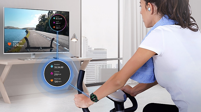 홈트레이닝을 하는 이들이라면 2024년형 삼성전자 스마트 모니터를 주목할 만하다. 2024년형 삼성 스마트 모니터에는 갤럭시 워치를 활용한 헬스뷰 기능이 추가되었다. 갤럭시 워치를 스마트 모니터와 연결하면 실시간 헬스 데이터가 화면에 노출되는 식이다. 운동 콘텐츠나 TV, OTT 프로그램을 시청하며 나만의 맞춤 운동을 즐기거나, 갤럭시 워치를 연결해 실시간으로 헬스 데이터를 확인, 동시에 스트리밍도 가능하다.