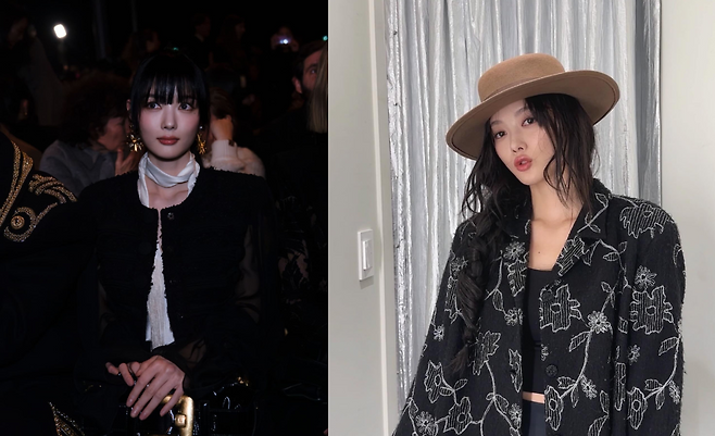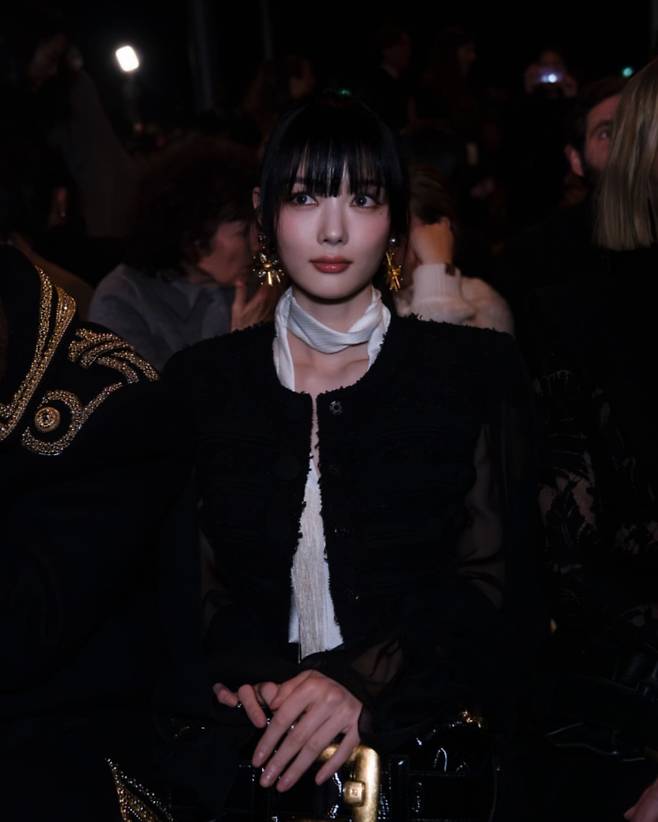 블랙 트위드 재킷과 화이트 스카프, 골드 이어링으로 고급스러운 클래식 무드를 완성했다. 또렷한 메이크업과 정돈된 앞머리, 어두운 조명 아래서 김유정은 한층 더 우아하고 성숙한 이미지를 선보인다. 런웨이 혹은 패션쇼 현장을 방불케 하는 분위기 속에서 존재감을 드러낸다.