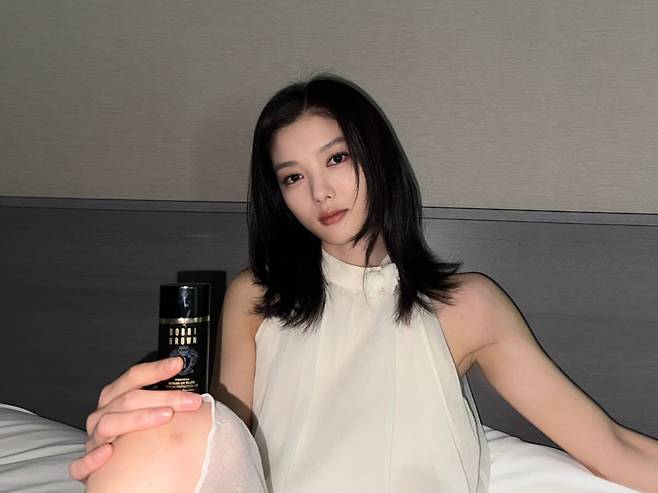 김유정은 아이보리 컬러의 민소매 블라우스에 자연스러운 블랙 헤어스타일로 미니멀하면서도 세련된 분위기를 연출하고 있다. 손에는 ‘BOBBI BROWN’ 제품을 들어 포인트를 주었으며, 전체적으로 군더더기 없는 심플함이 돋보인다. 침대 위에서의 자연스러운 포즈와 은은한 조명이 어우러져 내추럴한 무드를 강조한다.