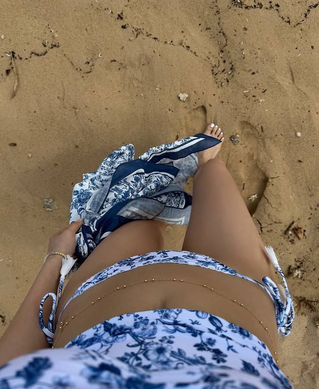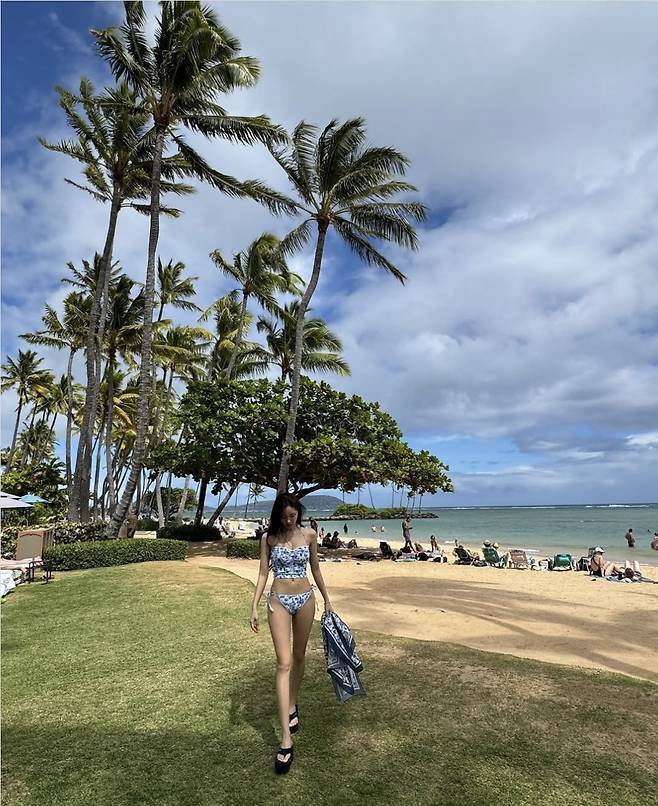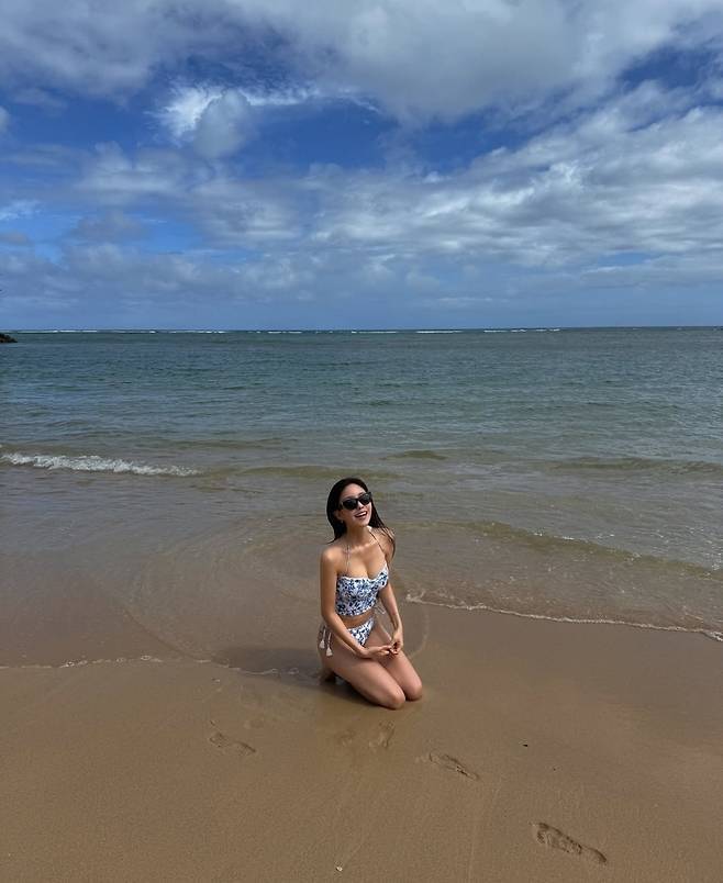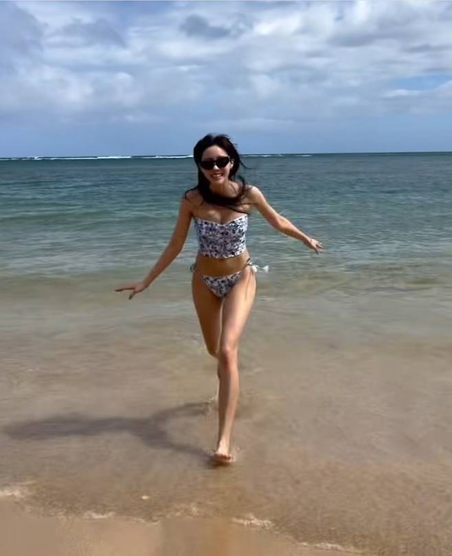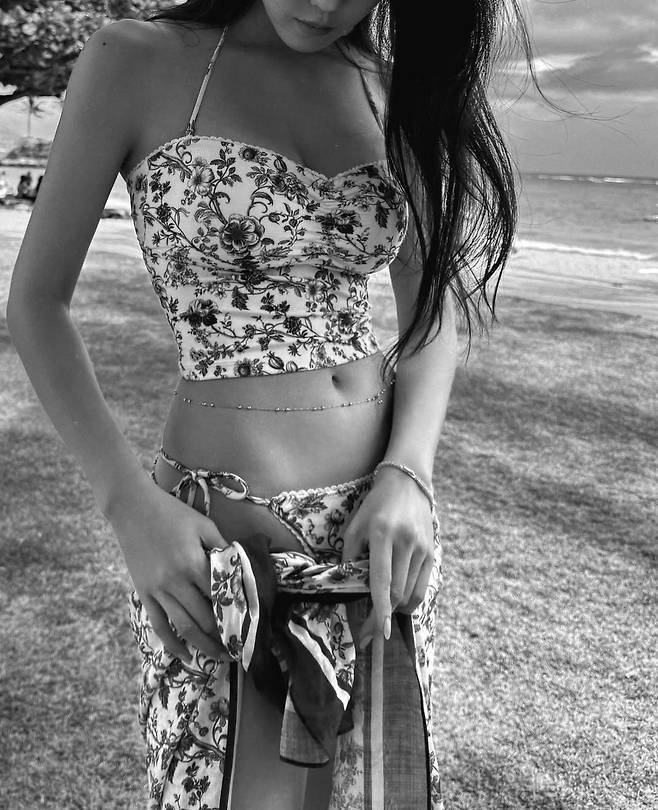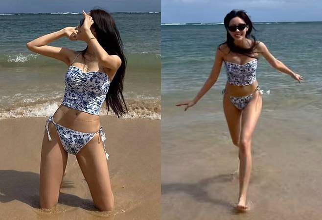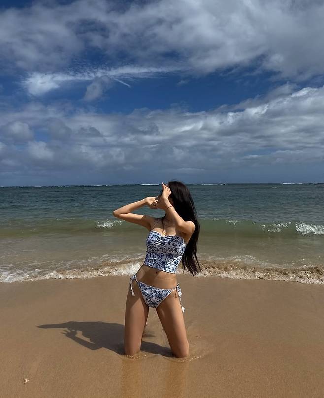 하늘빛 꽃무늬가 더해진 튜브탑 스타일의 플라워 비키니를 착용해 탄탄한 복근과 군살 없는 라인을 더욱 돋보이게 했습니다.