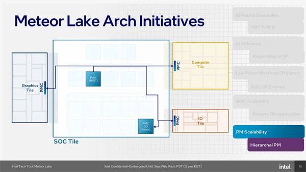 이를 통해 기존 통합 패브릭에서 발생하던 경합 이슈를 회피할 수 있다. 여기에 독립적인 전원 관리 컨트롤러(PMC)를 각 타일마다 추가해 독립적으로 전압과 클럭을 제어할 수 있으며, 타일마다 자체적인 DLVR을 추가해 전압 및 동적 패브릭 주파수 조정에 활용한다.