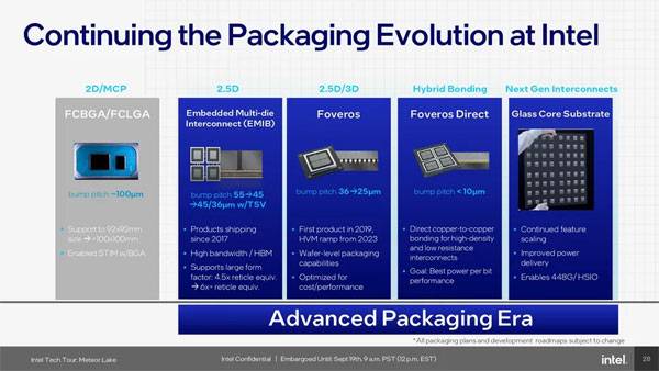 마이크론 범프 피치 크기는 레이크필드의 55마이크로미터서 36마이크로미터로 개선되어 제곱 밀리미터당 최대 770개를 배치할 수 있으며, 마이크론 범프 피치 크기는 향후 25에서 18까지 개선해 나간다는 방침이다. 인텔은 HBI(Hybrid Bonding Interconnects)와 결합한다면 마이크론 범프 피치 크기를 1마이크로미터까지 달성할 수 있다고 소개했다.