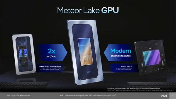 메테오 레이크의 GPU 타일은 인텔 Xe-LP 아키텍처가 적용되지만 외장 그래픽 카드에 쓰이는 Xe-HPG 아키텍처의 많은 부분을 차용했다. 전력 효율은 전 세대 대비 두 배 증가하고, 이를 위해 GPU 다이의 메인 엔진에서 분리한 Xe 미디어 및 디스플레이 엔진 블록은 SoC 타일에 통합시켰다.