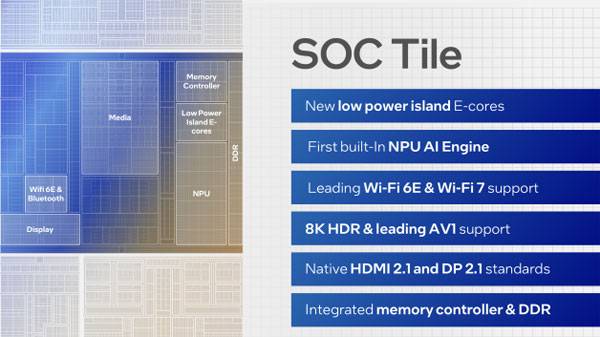저전력 구현을 초점을 맞춘 SoC 타일은 E-코어 클러스터와 AI 워크로드에 특화된 NPC 클러스터가 추가되었으며, 앞서 이야기한대로 기존 방식이라면 GPU 타일에 포함되었어야할 미디어/ 디스플레이/ 이미지 블록들을 품었다.