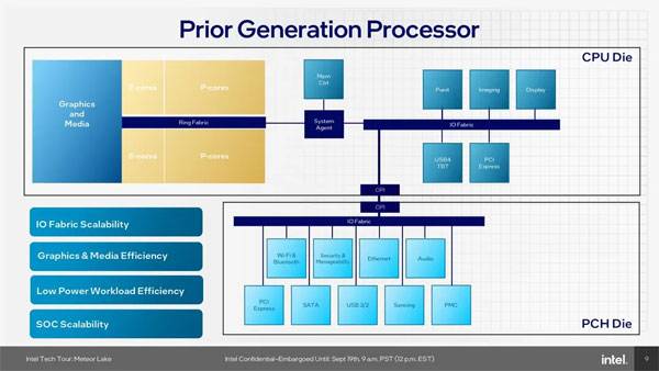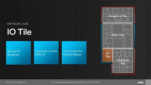 이런 한계를 극복하기 위해 메테오 레이크에서는 I/O 타일이 추가되었는데, 이를 통해 썬더볼트4나 추가 PCIe Lane 같은 외부 인터페이스를 추가할 수 있으며, 제품 타겟층에 따라 차별화된 기능 조정이 가능해졌다.