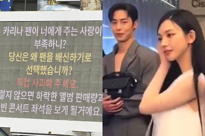 인기 걸그룹 멤버의 열애 소식에 일부 팬들은 카리나의 소속사 앞으로 트럭을 보내는 ‘트럭 시위’에 나섰으며, SM 주가가 떨어지고, 각종 성희롱까지 시달렸습니다.