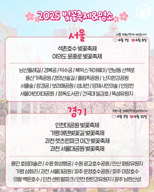 2. 지역별 2025 벚꽃 축제 및 벚꽃 명소 일정2-1. 2025 서울, 경기 벚꽃축제 및 명소