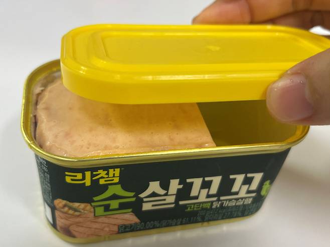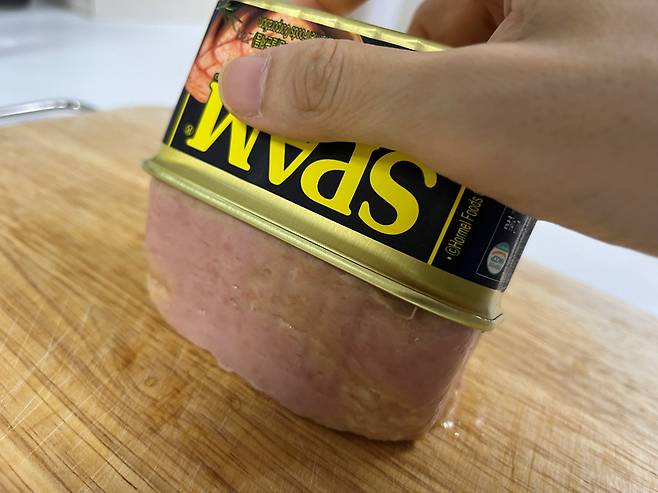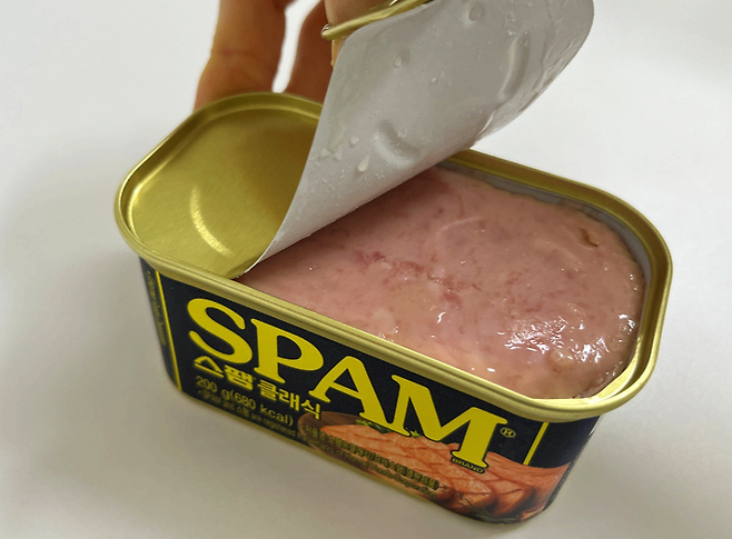 이제 살짝만 기울이면 쓱 하고 스팸이 부드럽게 빠집니다. 이렇게 하면 손대지 않고도 쉽게 스팸을 뺄 수 있습니다.
