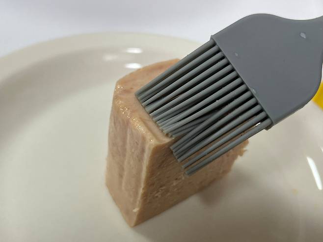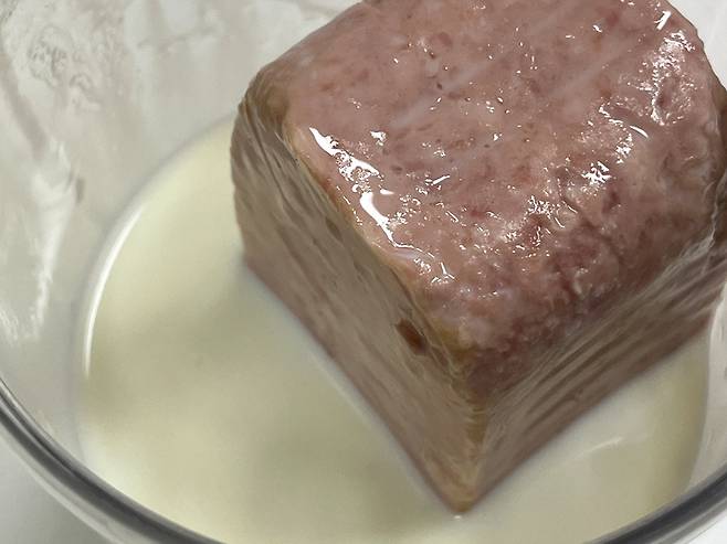 염분기와 잡내뿐 아니라, 우유 속 수분과 단백질이 스팸 표면의 기름기와 첨가물 등을 흡착합니다. 덕분에 덜 느끼하고 깔끔한 맛으로 바뀝니다.