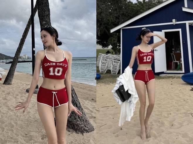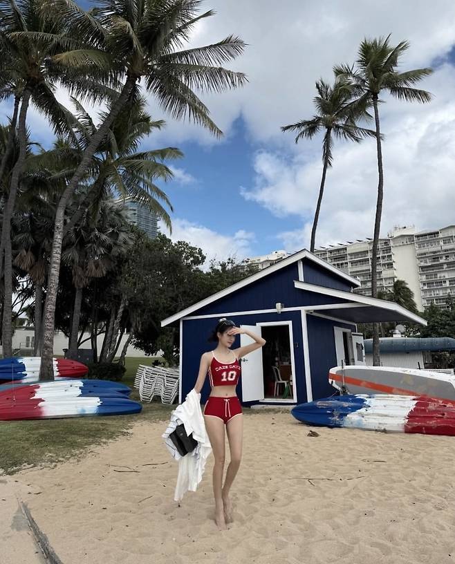 레드 컬러 스윔웨어를 착용하고 청량한 비치 감성을 제대로 살렸습니다.