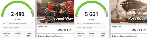 일반적인 타임 스파이와 파이어 스트라이크 익스트림, 레이 트레이싱 테스트인 스피드 웨이와 포트 로얄 결과를 보면 메인스트림 랩탑용 그래픽 카드인 지포스 RTX 4060에 어울리는, 적절한 수준의 성능을 기대할 수 있다.