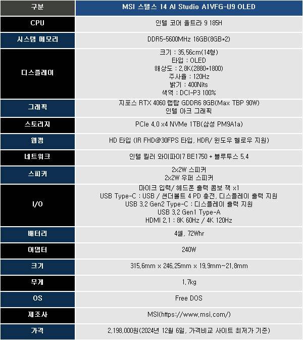 MSI 스텔스 14 AI Studio A1VFG-U9 OLED는 14인치급 모델이다. 크기부터 휴대성 우선 제품임을 어필하고 있고, 따라서 전반적인 시스템 성능을 좌우하는 CPU는 고성능 모델인 코어 울트라 9 185H를 탑재하는 대신, 그래픽 카드는 메인스트림급인 지포스 RTX 4060 랩탑 모델을 탑재해 균형을 맞췄다.