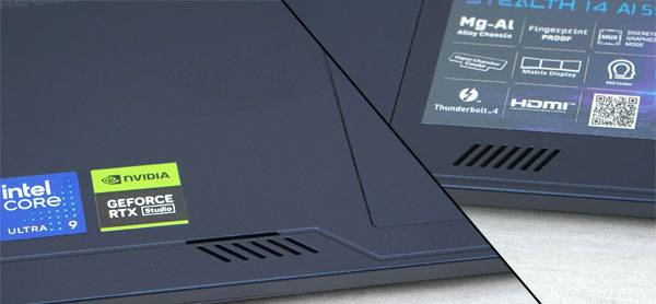 MSI 스텔스 AI Studio A1VFG-U9 OLED는 양 측면의 I/O 포트와 후면을 힌지 사이에 배치된 통풍구 외에, 모니터 양쪽 힌지 사이에도 추가로 통풍구가 배치되어 발열을 배출하도록 설계되었다. 후면 통풍구 사이에는 제품 브랜드인 스텔스(STEALTH) 로고를 따라 LED 조명을 배치해 자태를 뽐내며, 후면 양 코너쪽에도 LED 조명이 심어져 있다.