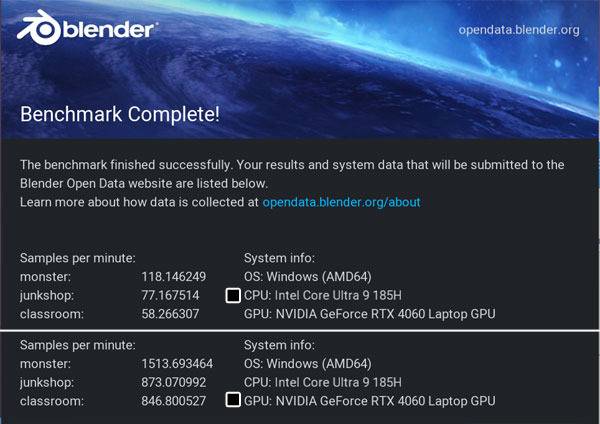 블렌더 벤치마크 4.2.0 버전 테스트 결과를 보면 CPU 테스트 결과는 MSI 소드 GF76 A AI B8VF-R7(라이젠 7 8845HS)보다 높지만, 동일한 GPU(RTX 4060 랩탑)가 사용되었음에도 관련 테스트 결과는 소폭 낮게 측정되었다. 이러한 GPU의 성능 차이는 시스템 TGP 세팅(105W vs 90W)과 쿨링 솔루션 등의 시스템 설계 차이가 반영된 것으로 판단된다.