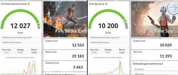 일반적인 타임 스파이와 파이어 스트라이크 익스트림, 레이 트레이싱 테스트인 스피드 웨이와 포트 로얄 결과를 보면 메인스트림 랩탑용 그래픽 카드인 지포스 RTX 4060에 어울리는, 적절한 수준의 성능을 기대할 수 있다.