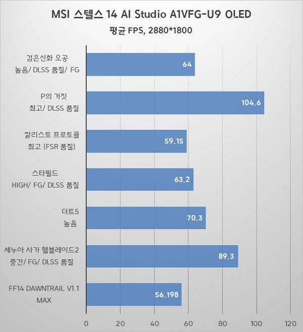MSI 스텔스 AI Studio A1VFG-U9 OLED의 게임 성능은 어느 정도인지 테스트했다. 3DMark는 본 제품의 디스플레이 해상도와 근접한 QHD 해상도 테스트를, 실제 게임은 전체 해상도(2.8K, 2880 x 1800)에서 테스트했다.