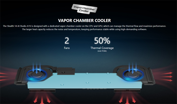 MSI 스텔스 AI Studio A1VFG-U9 OLED 쿨링 시스템은 블로워 타입의 듀얼 쿨링팬과 베이퍼 챔버를 활용해 구성해 휴대성을 높이면서 냉각 성능을 최적화 했다. 베이퍼 챔버 방식을 택했기에 히트파이프 방식과 달리 하단 통풍구로 내부 PCB가 노출되지 않아, 외부 이물질 유입으로 인한 손상 가능성을 최소화할 수 있다.