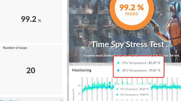 게임 성능 유지력 및 발열 정도를 알아보기 위해 3DMark Time Spy Stress Test를 실행해 봤다. 성능 유지력은 99.2%을 기록해 어지간한 데스크탑용 외장 그래픽 카드에 비해서도 뒤쳐지지 않는 것을 알 수 있다.