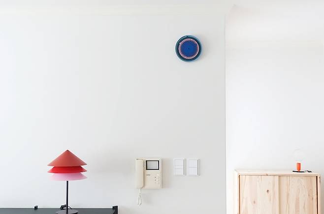 저희 집은 기본적으로 바탕이 모두 하얀색이기 때문에 도화지처럼 포인트컬러로 꾸미기 좋아서 소품을 배치하는 재미가 있어요. 색깔이 변한 인터폰이 이 집이 구옥빌라라는 걸 잘 보여주는 포인트죠?
