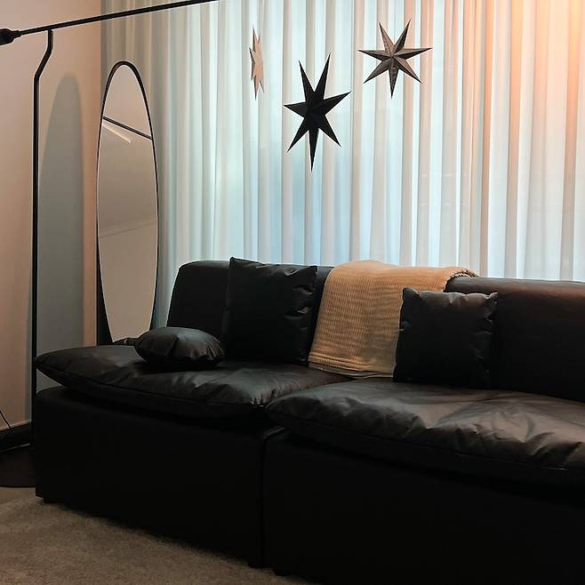 이 소파는 특수 원단으로 되어있는데요! 종이를 원단처럼 만든 재질인데 내구성이 가죽보다 튼튼해서 방수도 잘 되고 잘 쓰고 있답니다. 거실의 이 배치가 질릴 때 쯤 소파 1개를 2개로 나누어서 다르게 구성할 수도 있구요.