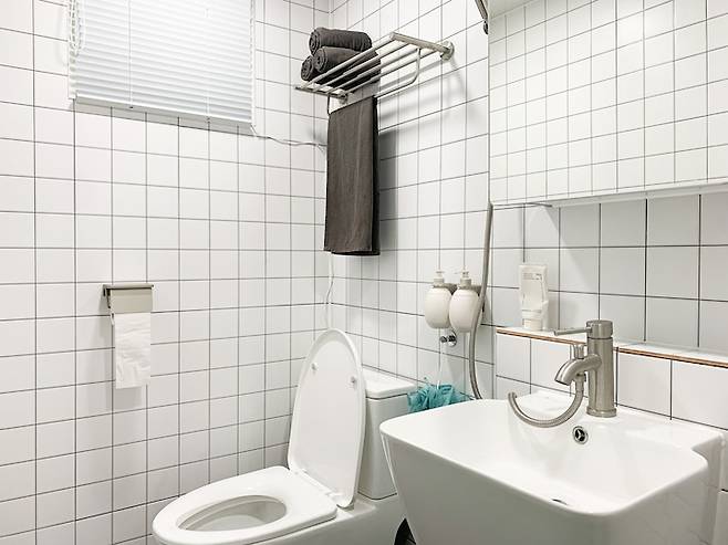 욕실1과 마찬가지로 화이트 모자이크 타일과 통일감 있게 바꾸었어요.