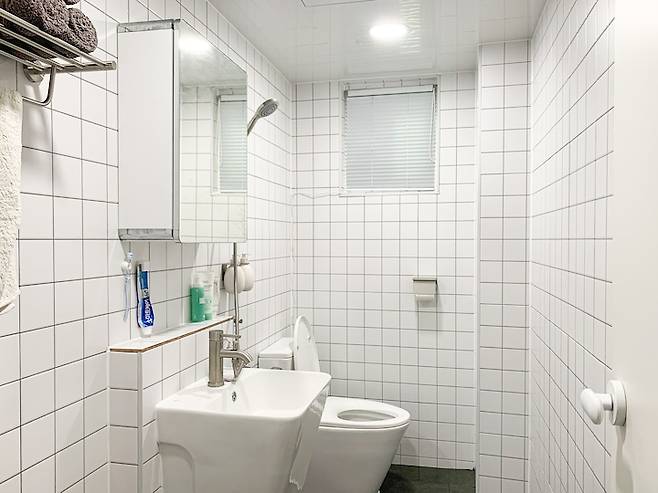 욕실은 통일감 있게 화이트 모자이크 타일을 활용하여 시공했어요. 구조는 크게 바꾸지 않고 기존의 낡은 설비만 바꾸는데 중점을 두고 진행했어요. 변기 위에 수납장은 사용하면서 불편할 것 같아서 세면대 위로 위치를 바꾸었어요. 타일 조적 선반을 두어서 통일감 있지만 포인트도 되는 나름의 포인트랍니다.