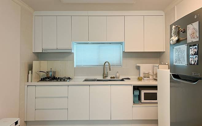 상·하부장을 원하는 조합으로 직접 그려서 시공사에 요청 드렸답니다. 처음 중간에 있는 창문을 가릴까 하다 있는 그대로 살렸는데 잘한 선택인 것 같아요!