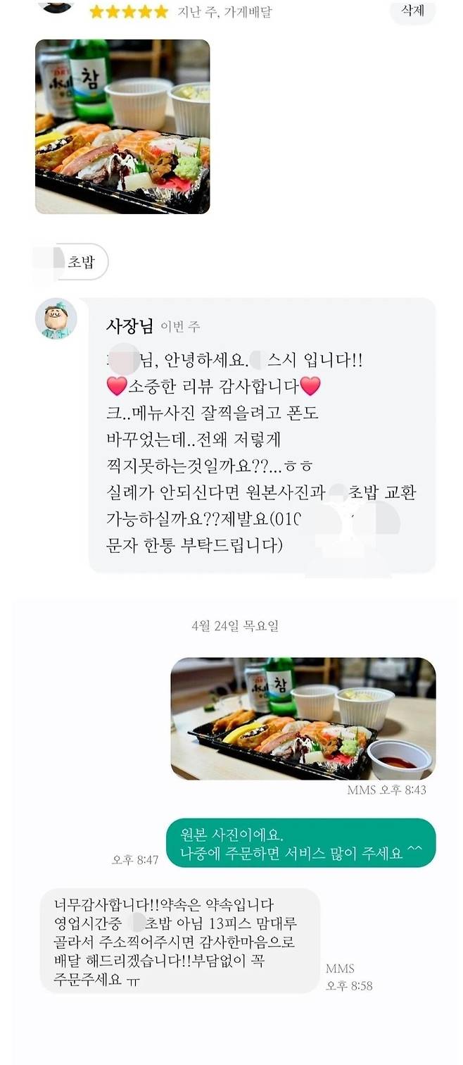 리뷰 사진을 초밥 13개 세트랑 교환하자는 사장님