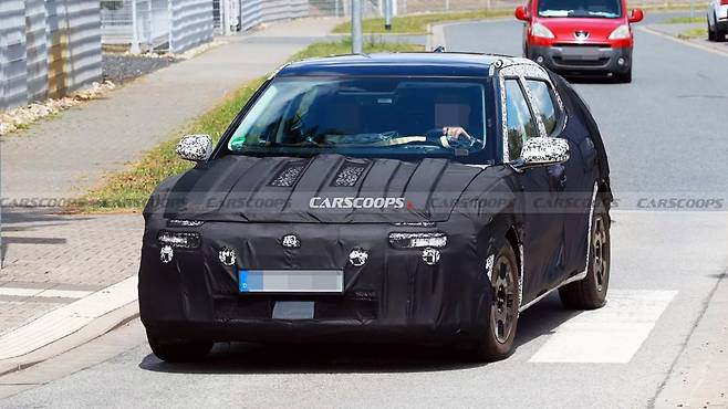 위장막 속 실루엣은 낮고 매끈한 전면부를 갖췄으며, 루프라인은 2열 헤드룸과 적재 공간 확보를 위해 높게 유지되다 뒤로 갈수록 급격히 떨어진다.