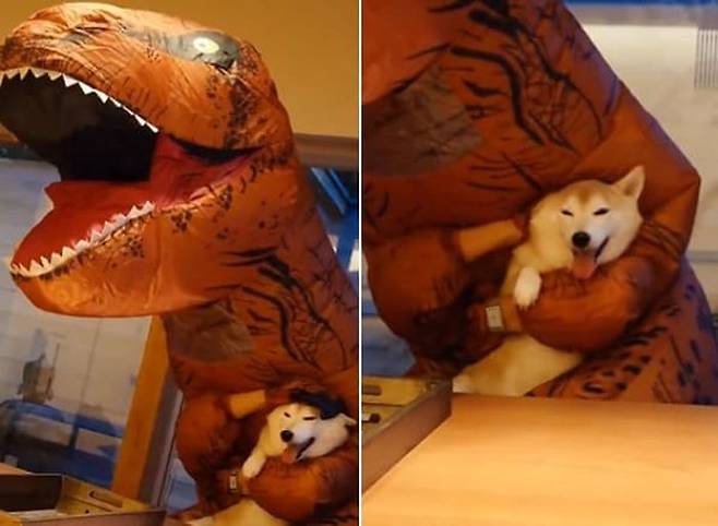 이날 집사는 문득 집에 있는 공룡 옷을 입고서 강아지를 품에 안으면 무슨 일이 벌어질지 궁금했다고 합니다.