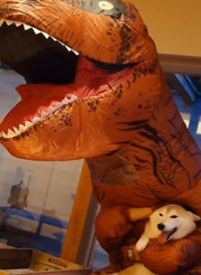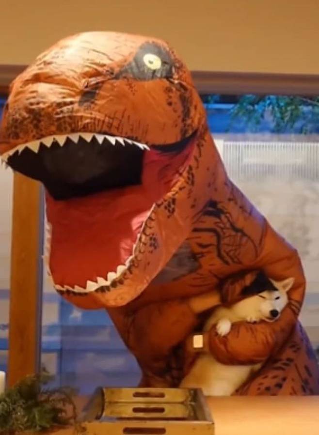 사연은 이렇습니다. 강아지를 키우는 집사는 SNS를 통해 공룡 옷을 입고 품에 강아지를 안자 벌어진 반전 상황이 담긴 영상을 찍어 올렸죠.