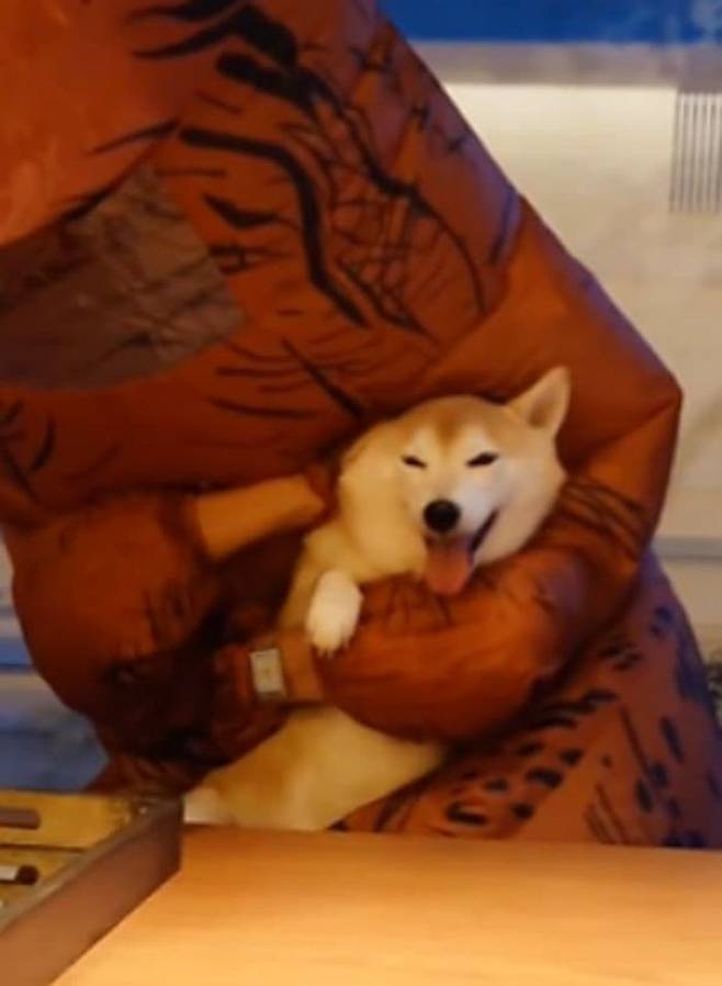 공룡 옷을 입은 집사의 품에 자리잡은 강아지는 계속되는 쓰담쓰담을 거부감 없이 받으며 기분 좋아 혀까지 내밀어 보였는데요.