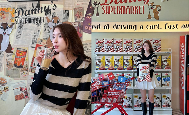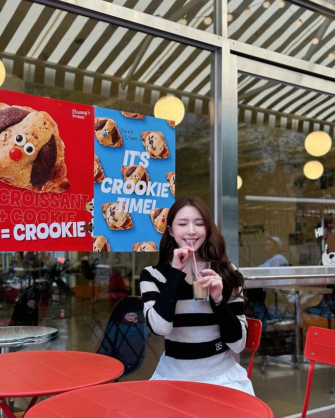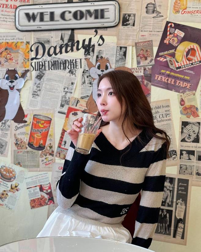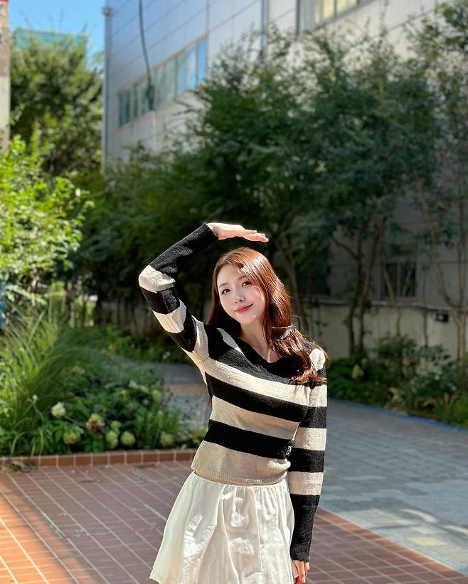 사진 속 성해은은 블랙과 베이지의 스트라이프 브이넥 니트를 입고 화이트 플리츠 스커트를 입어 러블리한 코디를 선보였다.
