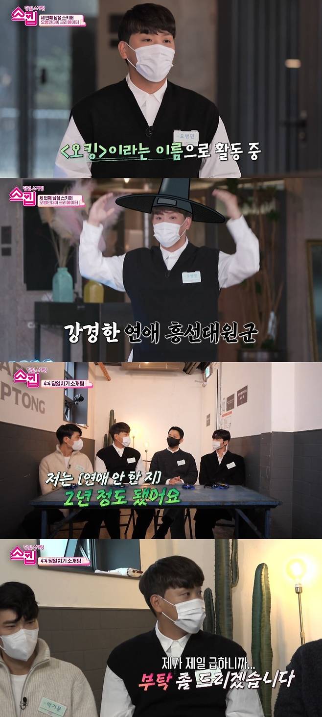이날 방송에서 세번째 남성 스키퍼로는 구독자가 200만에 육박하는 유튜버 오킹이 본명 오병민이라는 이름으로 등장했다. 그는 남성들이 모인 자리에서 최근 연애가 2년 전이라 밝히면서 본인이 제일 급하다는 어필을 해 웃음을 줬다.