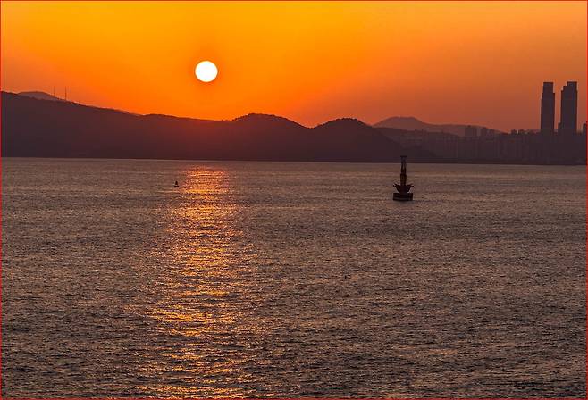 해가 지는 방향은 동백섬 쪽입니다. 바다 수평선으로 바로 떨어지지는 않지만, 동백섬의 능선을 따라 서서히 내려앉는 해의 모습은 오히려 더 깊은 여운을 남깁니다.