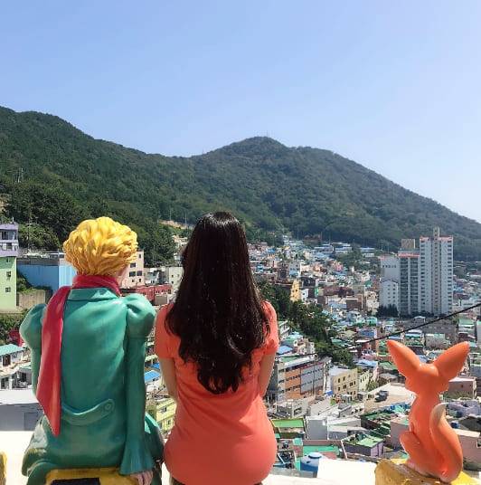 부산에서 어린 왕자를 만날 수 있는 감천 문화마을은 유명 인생샷 스팟이기도 한데요. 산자락에 가지런히 계단식으로 놓인 집들은 낙후된 모습이었지만 도시 재생 사업을 통해 문화 예술 지역으로 새롭게 발돋움했습니다. 지금은 산토리니처럼 부드러 파스텔 톤의 집들이 파도처럼 굽이치는 골목마다 모여 있어 이국적이죠.