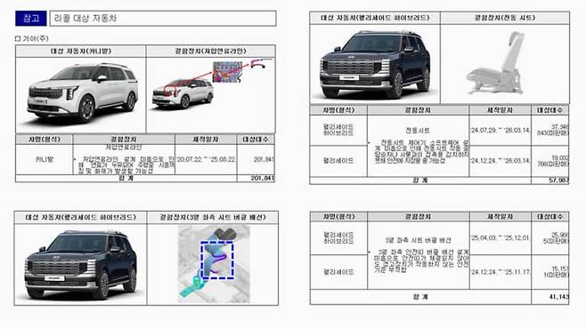 이번 리콜에서 가장 압도적인 물량을 차지하는 모델은 기아의 다목적 차량인 카니발입니다. 리콜 대상은 총 20만 1,841대에 달하며, 이는 전체 리콜 규모의 절반에 육박하는 수치입니다.