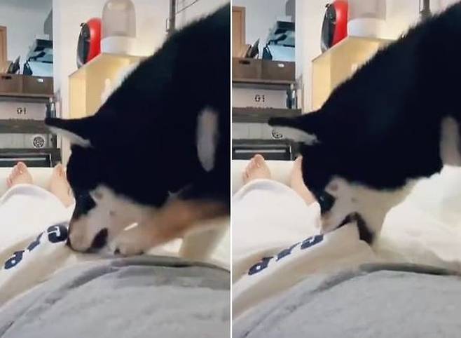 무언가를 열심히 찾기라도 하는 듯 시바견 강아지 료지는 열심히 냄새를 맡았는데요. 무슨 영문인지 갑자기 입을 벌리기 시작하더니 집사의 중요 부위를 꽉 무는 녀석입니다.